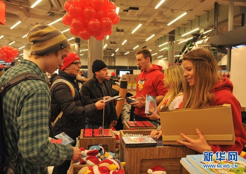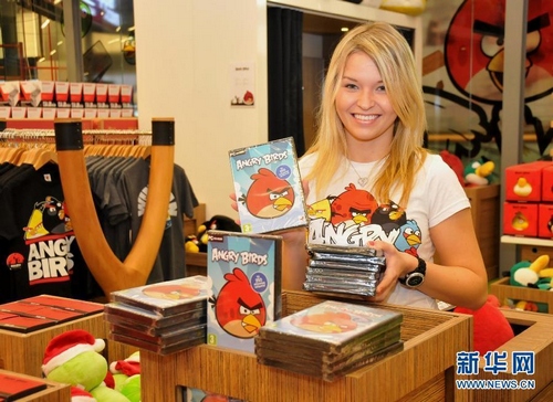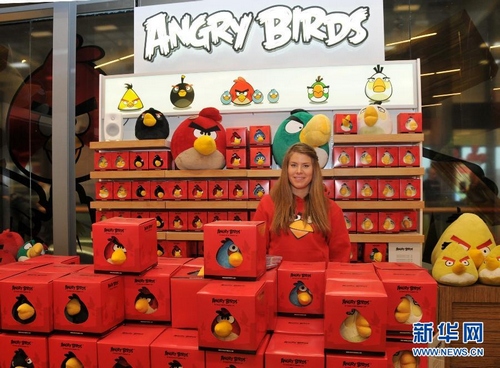 11月11日,在芬兰赫尔辛基“愤怒的小鸟”主题专卖店内,人们身穿“愤怒的小鸟”主题服装合影。 11月11日11时,芬兰罗维奥游戏公司“愤怒的小鸟”全球首家主题专卖店在赫尔辛基开张。专卖店不仅销售“愤怒的小鸟”游戏、毛绒玩具、T恤衫、书包和书籍,还为顾客提供自己动手体验“愤怒的小鸟”游戏魅力的机会。罗维奥公司40%的收入来自“愤怒的小鸟”游戏的衍生产品。根据该游戏推出的各种玩具已成为市场上的畅销货。目前,该公司每月出售大约一百万件的“愤怒的小鸟”T恤衫和一百万件的毛绒玩具。由芬兰罗维奥游戏公司为触摸屏智能手机研发的休闲智力游戏“愤怒的小鸟”自从2009年底推出至今,已迅速火爆全球,获得巨大成功。目前,在各种游戏平台的全球总下载量超过5亿次,创造了移动游戏领域的成功神话。