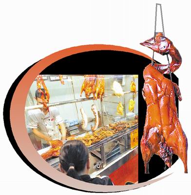 而卫生条件也较差,地板砖上沾满了泥点和血水,垃圾也没整理干净,几家售卖烧鹅、猪手等烧腊熟食的档主刚拖完地又去案头上作业。