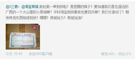 随后两天,各地消费者陆续在网上晒起收货的快乐:南京网友@Ginny吉利11月14日上班,收到了光棍节当日拍下的IP4手机彩壳,开心之余发了条微博:“周一上班收包裹最开心了!哈哈”