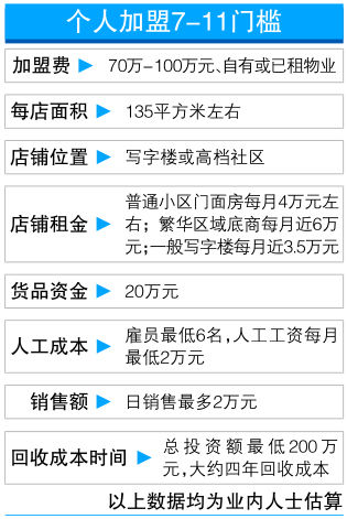 昨日,7-11开设了在上海地区的第100家分店,其相关负责人表示,明年起将开放上海地区的加盟连锁。“此次7-11加盟是企业自身的突破。7-11一直都没有真正实践加盟,此次不仅是试水,而是快速扩张。” 7-11一参股公司负责人透露,其在半年前就已开始加盟业务,加盟方必须是有一般纳税人资格的公司,7-11方面会为加盟商提供商品、技术和管理等方面的支持,但不针对个人加盟。不过,目前加盟业务已放宽到个人。