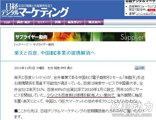 据亿邦动力实战社区相关人士爆料,日本媒体已就此事进行报道,称乐天和百度在中国的“乐酷天”电子商务公司可能需要被重新审视。亿邦动力网查询到日本相关媒体报道,原文翻译如下: