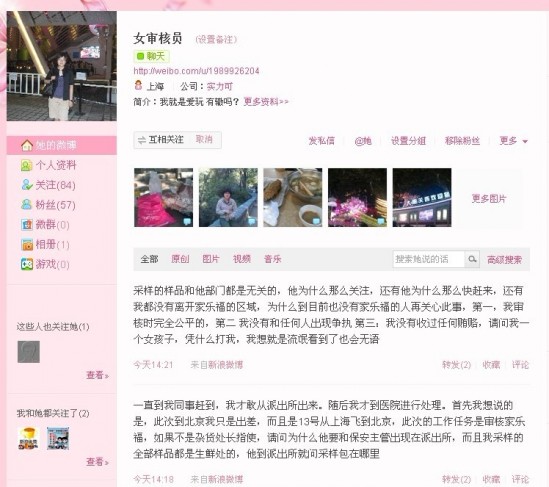 从今天下午13:48至14:21,网友“女审核员”在新浪微博接连发文,称自己在北京姚家园家乐福超市例行检测时,发现卖场有8包食品发霉。在该超市杂货处提出取消“不符合项”的检测结果时,被“女审核员”拒绝。事后,该网友欲打车离开超市,结果被陌生人殴打。以下为微博全文: