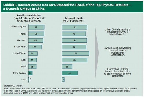 2010年的交易额中,79%来自淘宝商城。CINIC数据显示,截至2011年6月,中国网民达4.85亿。波士顿咨询称,“互联网能达到实体零售店无法到达的范围。中国广阔的地域阻碍了实体零售通路的成效”。