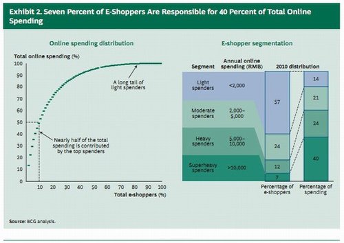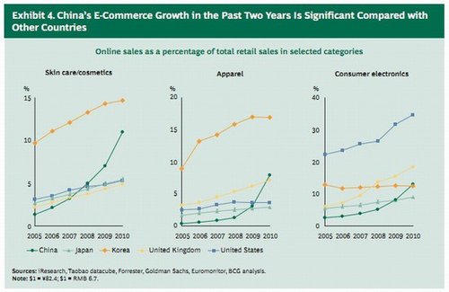 波士顿咨询报告称,2008年中国的电子商务销售额为1280亿元,到2010年几乎翻两番达4760亿元。在中国,去年有23%的城镇人口进行了网络购物。到2015年,这一比例将达到44%。