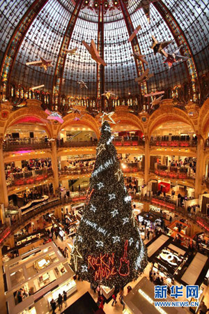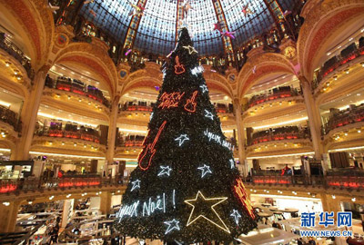 这是11月22日拍摄的法国巴黎老佛爷百货公司的圣诞树。随着圣诞节日益临近,法国巴黎老佛爷百货公司花窗高悬、圣诞树耸立,以年年相似不相同的标志性景观盛装迎圣诞。