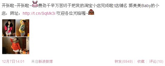 12月7日,郭美美自己在微博称baby网店开张了,希望大家多多支持。郭美美开网店的事情一下子就传开了,仅仅两个小时就已经转发了超过4000次了。