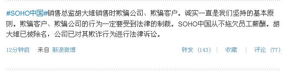 12月15日,在上海分公司销售部总监胡大维发微博爆料的第3天,SOHO中国在新浪微博的官方账号发布一则消息:“销售总监胡大维销售时欺骗公司、欺骗客户。诚实一直是我们坚持的基本原则。欺骗客户、欺骗公司的行为一定要受到法律的制裁。SOHO中国从不拖欠员工薪酬。胡大维已被除名,公司已对其欺诈行为进行法律诉讼。”