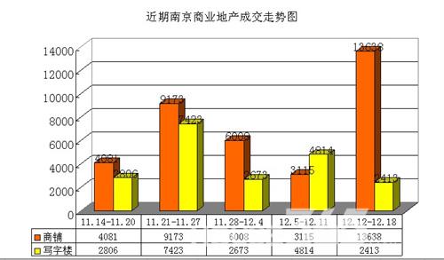 网上房地产数据统计,截至12月18日,上周(12.12-12.18)南京商铺成交面积约13638平米,写字楼成交面积约2413平米。与之前一周相比,商铺成交量暴涨337.8%,写字楼成交量下跌49.88%。(上上周南京商铺成交面积约3115平米,上上周南京写字楼成交面积约4814平米)。