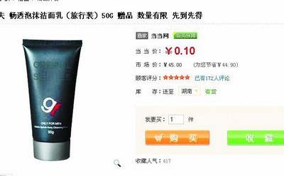 从前晚到昨日凌晨6时左右,这款0.1元的洗面奶吸引了不少网友抢购。新浪微博、腾讯微博以及QQ群上都有不少人发布了信息,引起围观。上晚班的郝先生在昨日凌晨2时左右也在抢购,“开始点了几次购买都没有反应,估计是同时抢购的人太多了。”郝先生说。