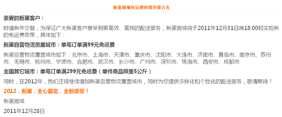 据悉,新蛋商城昨日公告称,将于2011年12月31日晚18时起实施全新物流政策,内容包括,新蛋自营物流覆盖城市单笔订单满99元免运费,全国其他城市单笔订单满299元免运费(单件商品限重5公斤)。据新蛋内部人士透露,低于99元的订单,新蛋将收取每件4.5元的运费。而就在上个月,京东商城即宣布将参照行业做法修改免费策略,对金额不足39元的订单收取5元运费。