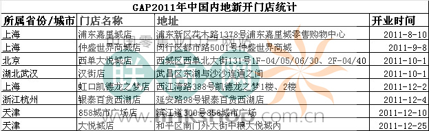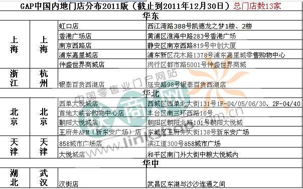 一、GAP2011年中国内地新开门店统计(依据GAP官网数据和媒体报道)