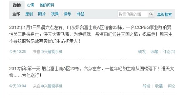 今天上午,有新浪微博网友“野夫刀”在早上9点前后发布消息称,“2012新年第一天。烟台富士康A区宿舍23栋,六点左右,一位年轻的生命从四楼落下!”据该网友表示,跳楼者是一名烟台消费电子产品事业群(CCPBG)的男性。