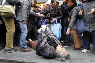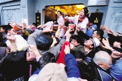 2012年1月1日,浙江省杭州市张同泰药店周围,等待取粥的人们早早就排起了长长的队伍。但是,由于人群过多,秩序杂乱,施粥活动刚一开始,便遭到了一大群市民的围抢,场面一时失控,有一位白发老人被拥挤的人群推倒在地,险些酿成踩踏事故,活动只能紧急暂停。最后110民警及时赶到现场进行协调,才让“腊八施粥”活动得以顺利进行。 (来源:新京报 郭新 摄)