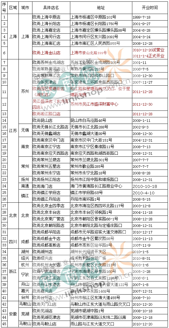 欧尚超市在华门店表:(红色字体为2011年度新开门店)