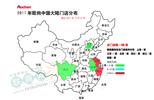 据联商网统计,截止到2011年12月31日,欧尚在华门店共有45家,本年新开门店为3家。分别为2011年1月4日正式开业的欧尚上海金山店、2011年12月28日开业的欧尚园区星塘街店(湖东店)、2011年12月28日开业的欧尚淞江路口店、2011年12月30日开业的吴江盛泽店(东方花园店)。