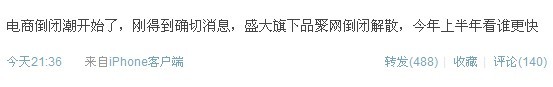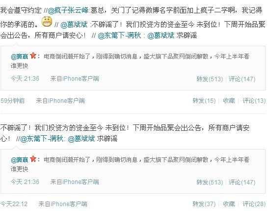 联商网快讯:1月6日晚上21点36分,微博网友@窦赢发布了一条关于盛大旗下品聚网倒闭解散的消息,顿时引来不少网友的转发与关注。@窦赢:“电商倒闭潮开始了,刚得到确切消息,盛大旗下品聚网倒闭解散,今年上半年看谁更快?”。随后一些关注电商发展的网友纷纷指出要求品聚网出来辟谣。随后22点左右,品聚网创始人葛斌斌在微博中转发了那条关于盛大旗下品聚网倒闭解散的微博,并承认:“不辟谣了!我们投资方的资金至今未到位!下周开始品聚会出公告,所有商户请安心!”。让这次看似“不靠谱”的谣言,成了名符其实的“电商悲剧”。