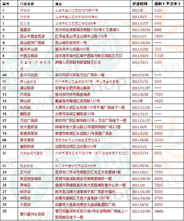 据联商网统计:2011年新开门店30家,截至2011年12月31日家乐福中国内地门店总计203家(关闭门店为7家,关闭门店不包括在总门店数中)