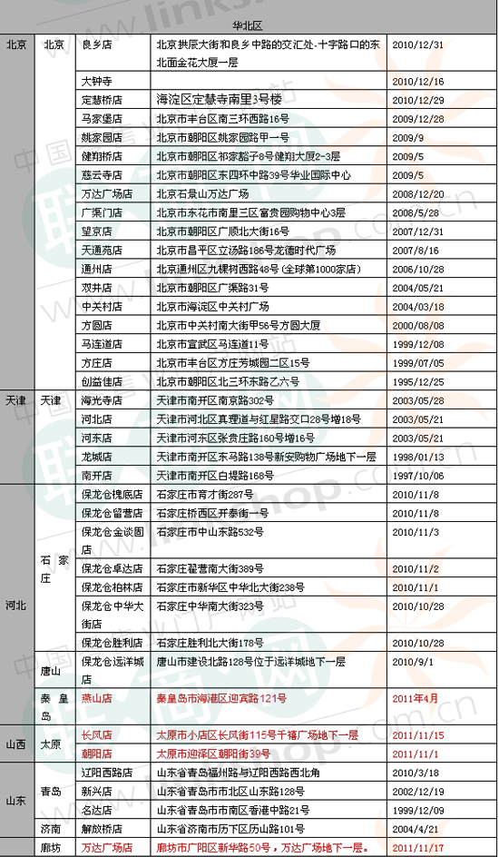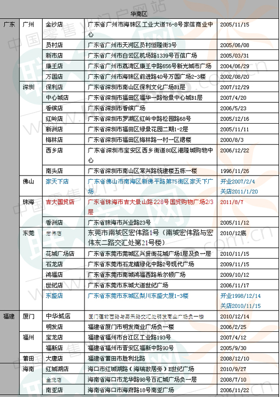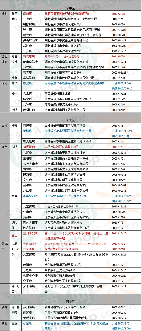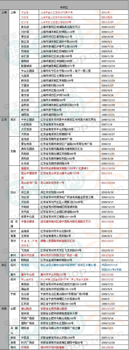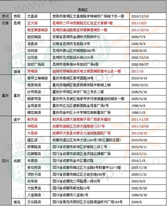 家乐福中国内地门店分布2011版(注:其中红色字体部分为2011年新开门店面家,蓝色字体为关闭门店共7家)