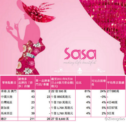Zhengdao:【香港Sasa截止11.9.30止6个月销售表现】港澳区16亿,增长35%,LFL增长24%(美元偏软大陆通胀+大陆及海外旅客+引入更多独家品牌+新库存策略);大陆1.08亿,增长81%,LFL下降3%(缺少经验导购+库存等成本增加);台湾1.07亿;新加坡1.17亿;马来1.17亿。港澳销售占了8成,平均单店半年2.6千万。