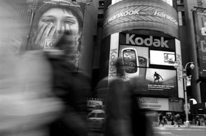 1月19日,行人经过美国纽约时报广场一块巨大的柯达广告牌。