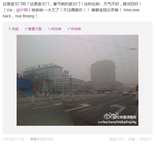 临过年了,北京遭遇入冬以来最差的天气情况,连日的阴霾天气PM2.5数值经常爆表。虽然天气情况不是很好,但是北京的交通却迎来了久违的畅通。早晚高峰时间的车流和人流也明显减少,上下班时间缩短近一半。对于有车一族来说,春节期间出行将非常方便。