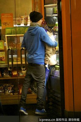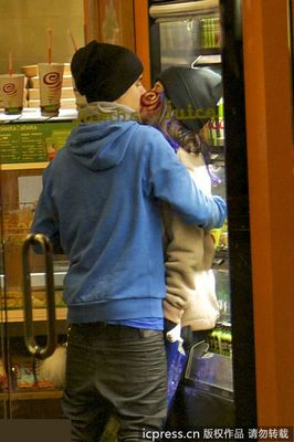 当地时间1月16日晚,贾斯汀·比伯与女友赛琳娜·戈麦斯来到迪士尼乐园游玩,两人戴同款黑色绒线帽。在饮料店中贾斯汀把赛琳娜推向角落,来了个深情一吻。 (来源:凤凰网)