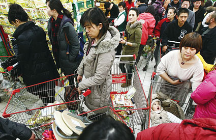 记者前天晚上10点在双井地区某外资超市看到,收银台前的队伍单条都排出10余米,每个都有15拨以上的顾客在等待结账。“我们已经在超市里逛了1个小时了,因为超市晚9点以后有返券,特意晚点儿来购物。”顾客徐女士说。