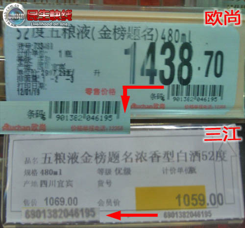 近日,一则《同样的商品,在欧尚和三江的价格相差巨大》的帖子在天一论坛引起众多网友围观。发帖者“往事一幕幕”称,他在宁波两个不同的大超市内发现,五粮液52度“金榜题名”酒(480ML),在欧尚超市卖1388元一瓶,而在三江超市卖1059元一瓶。两家超市出售的价格相差巨大令他十分不解。同时,“往事一幕幕”还疑惑“为何酒类商品不能退货”?记者对此进行了采访。
