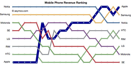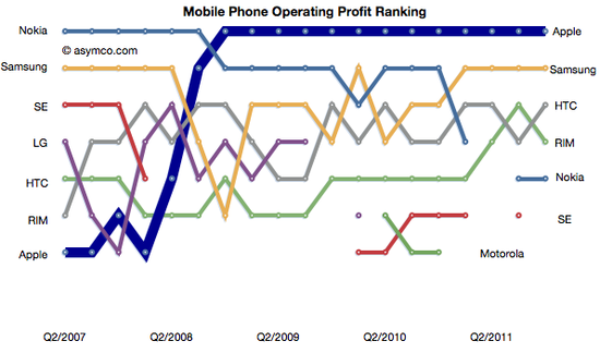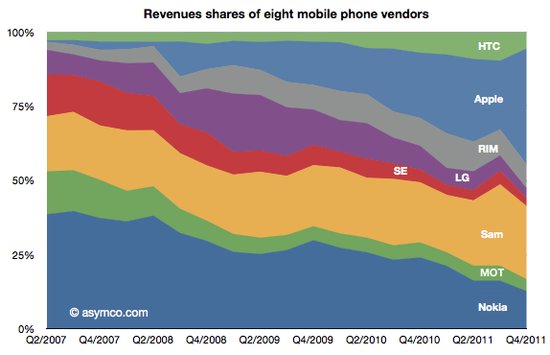 从去年第四季度全球手机营收的份额排名来看,苹果以39%仍排名榜首,三星以25%位居次席,诺基亚则以12.6%排名第三,其后是RIM(8%)、HTC(5.5%)、摩托罗拉(4%)、LG(3.3%)和索尼-爱立信(2.7%)