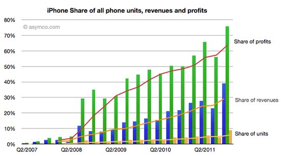 去年第四季度,虽然苹果iPhone在全球手机出货量市场的占有率仅从2010年第二季度的3%上涨至8.7%,但苹果在整个手机市场的利润份额却从当时的39%一路飙升至75%。