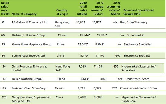 从2011年全球性权威榜单排名来看,由全球顶尖零售行业研究公司plantar Retail发布的2011年全球TOP30电器/娱乐及办公用品零售商榜单中,国美电器名列第11位,领跑中国零售行业。在由全球一流的零售洞察力与咨询公司Kantar Retail发布的全球TOP50零售企业榜单中,国美又成为唯一入选的中国零售业品牌。很多国际权威机构在对国美做出综合评测时,均对国美的商业模式转型表现了浓厚的兴趣,并做出了高度评价。