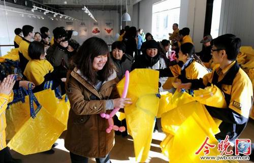 宜家工作人员一字排开欢迎首批客人。