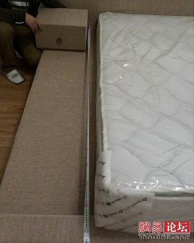经过一个星期的等待后,古沙的两位师傅送来了床架,待床架装好后,却发现床垫装不下去,床垫露出床外一大截。马先生拿来尺子一量才发现,师傅送来的床架只有180×193.5cm,与预定的180×200cm差了一大截,床头柜抽屉里面也不平整,像“鱼鳞”一样。“当场打电话给古沙的吴经理,他让我们收下床架买相应的床垫。我不肯签收,他却说先考虑好再给我们处理结果。”