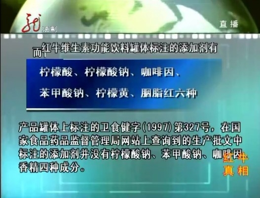 2月9日,黑龙江电视台法制频道播出特别节目《“红牛”真相》,哈尔滨食品药品监督部门负责人在接受采访时表示,红牛饮料存在标注成分与国家批文严重不符、执行标准和产品不一致等一系列问题。