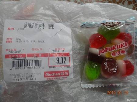 我找出新闻爆料源指的两张照片,发现蹊跷。“低价”欧尚的标签是特*(空白)糖果,“高价”联华是特级糖果。依欧尚价签的有效期,加工日期2012年1月7日,有效日期2012年1月14日,现存保质期7天,而徐福记此类糖果的保质期通常在18-24个月,要么这是快过期的“临保产品”特价处理,要么这张价签是假的。