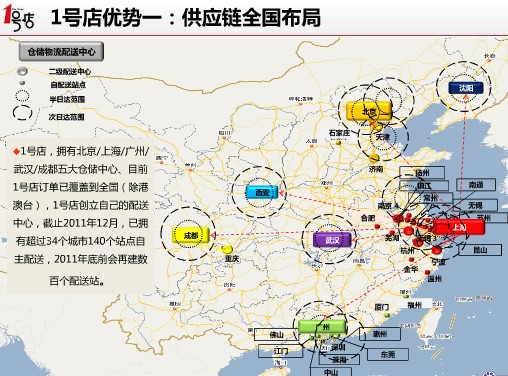 其次,全国物流基地的投建不是一笔小数,而随着销量和商品品种的提升,库存管理和配送对1号店供应链管理系统的要求会越来越苛刻。相关资料显示,截至2011年底1号店员工人数达4800人,仓储面积达22万平米,配送涵盖34个城市140个站点。截至2011年7月,1号店已经完成对北京、上海、广州、武汉、成都五地的战略布点,全国物流基地建设开始大提速。