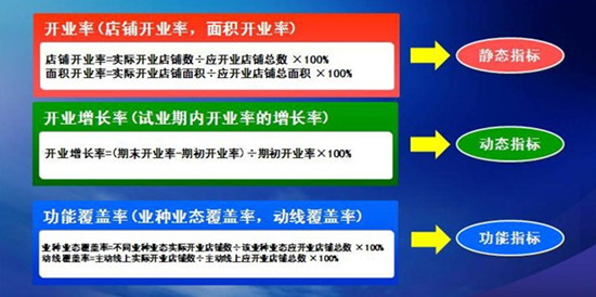 综上所述,购物中心指标体系主要有三类,静态指标:购物中心开业率;动态指标:购物中心开业增长率;功能指标:购物中心功能覆盖率,参见图1。除了上面介绍的指标公式外,还可以根据购物中心的和经营管理的需要,设计出其它更细的派生指标。