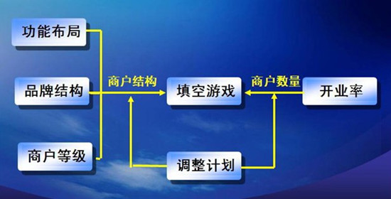 在购物中心招商过程中,最难兼顾的是商户结构和商户数量。商户结构包括功能布局、品牌结构和商户等级。严格地按商业规划保证商户结构,是实现定位的基本要求,也是保证购物中心功能覆盖率从而促进开业增长率的基本要求,但同时对商户数量造成了很大的限制,也制约了开业率。作为一个负责任的经营管理团队,应该优先保证商户结构。当现实条件不具备,招不够合格商户时,可通过事先制定调整计划适当放开条件招商满足一定的开业率要求,日后按计划调整。我们用“填空游戏”示意于图2。