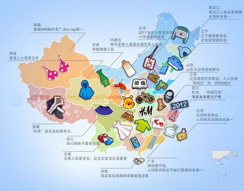 2011年,时尚界风云多变。秋裤席卷重来,再也不畏缩在厚重的裤子之下,而是外穿变身“legging”登入各时尚达人衣橱;丝瓜也不再只是食物,提取成水跻身大热护肤品行列。而在2011年,淘宝网上各地消费又呈现出什么特征呢?