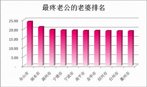 在最贤惠的女性地区排名中,浙江省又再一次凸显老大地位。只不过,第一由宁波换成了舟山。2011年,舟山女性用户为男性购买用品人数比例高达23.98%,人均消费901.72元。此外,舟山也成为最疼老公的老婆、最爱健身的男性、最爱买吉他的城市等。