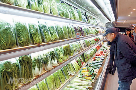 连日的大雪几乎没有影响到哈市精品超市的蔬菜供应。记者走访卓展、麦凯乐、远大、松雷等商场的精品超市发现,这里的蔬菜大多色泽鲜明,没有污垢和泥点,被放进托盘中,用保鲜膜封闭,贴上“精品蔬菜”的标签,精致整齐地被摆放在超市并不很大的保鲜区域里。