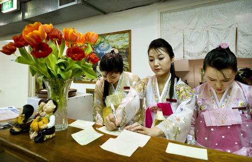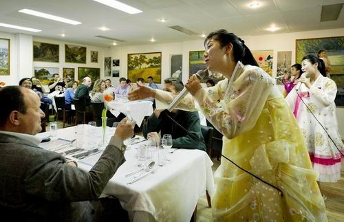 与海外其它朝鲜餐馆一样,这里也有几名身穿朝鲜传统服装的年轻女服务员为顾客提供服务,还会献唱朝鲜歌曲。
