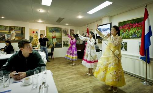 3月10日,荷兰阿姆斯特丹,穿着朝鲜传统服饰的店员穿梭往来提供服务。这家餐馆可以说是朝鲜与世界其它国家进行交流的窗口,今后将通过举办演讲会、上映电影、展出美术作品、宣传朝鲜旅游商品等,起到与西方国家进行沟通的桥梁作用。
