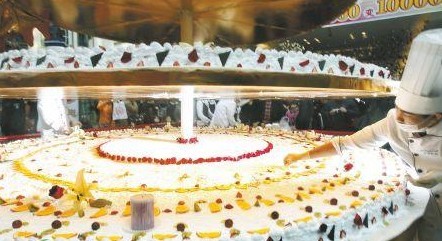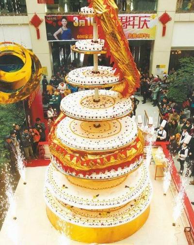 该商场负责人说,这个蛋糕是为该商场店庆制作,预算已超过7万元。共计用了260公斤鲜奶油、200多公斤面粉、300多公斤鸡蛋、100公斤新鲜水果、80公斤巧克力和多种花卉,才做出如此壮观、口味独特的立体蛋糕。