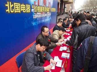 北国电器在3·15之际推出“价格服务双保险”大型签售会,由电器事业部张部长和各品牌老总现场签售礼金卡,购全场家电单台满额直抵现金使用,并且从上午10:30起,凡是光临北国电器任意门店的顾客可免费获赠由各个店长签售的200元礼金,购全场家电满额直抵现金使用,除所购商品大力度促销外,北国电器在今天还首次推出:在北国电器购买的大家电产品在厂家售后承保的基础上再延长1年的承保服务!今天只要购大家电的顾客均可凭小票领取延保卡一张,享受在品牌的保修期基础上再延长一年保修的服务。