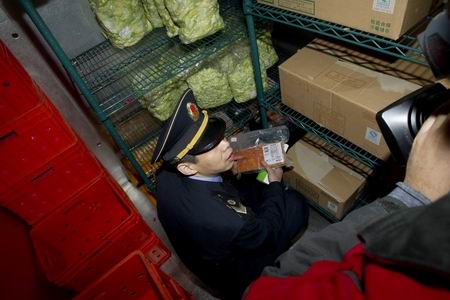 据央视报道,3月1日12点35分,员工炸制了一盘盐焗鸡翅,6分钟后被放入了保温箱中。按照操作规范,盐焗鸡翅的保存时间为30分钟。但13点55分,这盘鸡翅还在保温箱中存放着。一直到14点35分,保温箱中的鸡翅仍然在待售,此时已经超过保存期1小时24分钟。图为卫生监督所的工作人员,在麦当劳食品储藏室内检查。