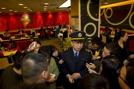 卫生监督所的检查人员,在麦当劳店内回答记者问题。
