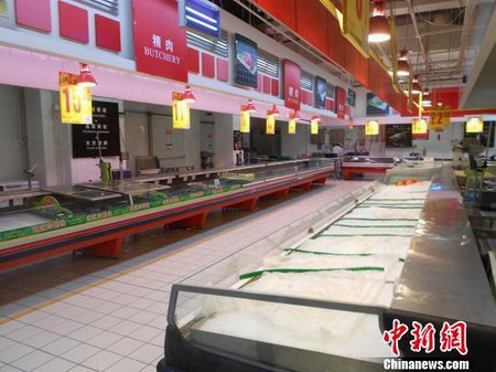 家乐福郑州花园店地处郑州繁华的商业区,紧邻国贸360和大商新玛特两个大型购物广场。3月16日中午,记者在家乐福郑州花园店看见,平日顾客络绎不绝的超市里显得异常冷清,仅有为数不多的顾客在浏览商品。平日放置生鲜家禽的冷柜,已经空空如也,以前摆放在柜台里的冷冻家禽已经不见了踪迹,就连生鲜猪肉也被下架,整个生鲜肉区域鲜少见到工作人员。对于这一区域的工作人员和货物的去向,超市内的其他工作人员绝口不提。