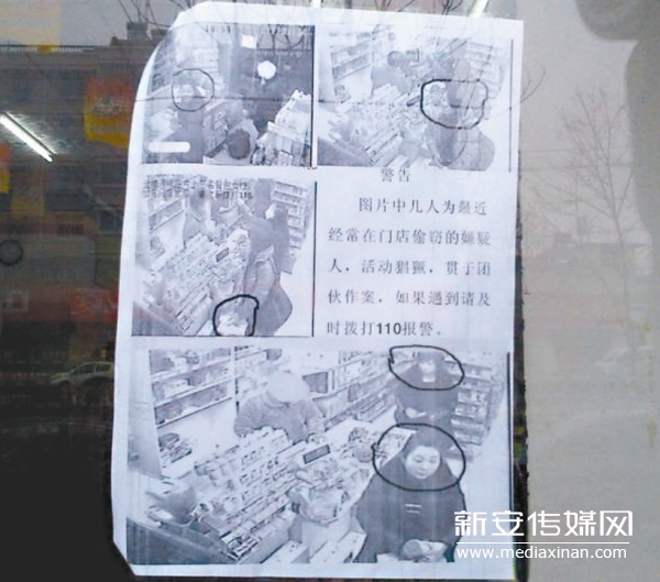 在阜阳莲花路满好便利店的玻璃门上,一张黑白打印的“小偷图片”格外引人注目,图片里两个中年妇女的头部用笔画了一个圈,模样非常清晰(如图)。图片上写着:警告,图片中几人为最近经常在门店偷窃的嫌疑人,活动猖獗,惯于团伙作案,如果遇到请及时拨打110报警。莲花路满好便利店店员告诉记者,除了莲花店,其他门店也张贴了,主要是有些门店先后遭遇行窃事件,为了加强防范。