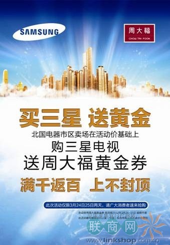 联商网消息:买三星,送黄金!听说过吗?3月24日-25日在北国电器购三星电视,在最低价基础上,满1000元返100元现金券,上不封顶!凭券在北国周大福专柜直抵现金使用!